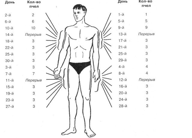 El procedimiento se lleva a cabo de acuerdo con un cierto esquema. Al realizar la apiterapia en casa, debe conocer los puntos de picadura. Sin esta información, no será posible lograr el efecto terapéutico deseado. Practican 2 esquemas básicos para colocar abejas: en áreas problemáticas y puntos biológicamente activos.La mayoría de las veces, las mordeduras se provocan en el área de los hombros y las caderas. Es en estos lugares donde el veneno de abeja penetra más rápidamente en el sistema linfático. Las manchas dolorosas en el cuerpo se determinan mediante palpación. Los insectos se colocan directamente sobre ellos.