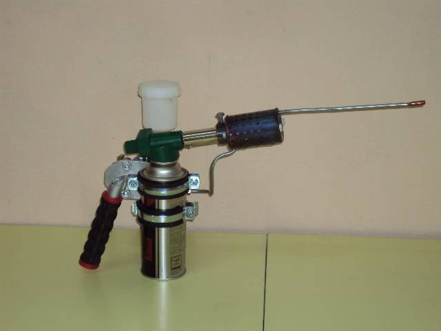 - Girando la manija de la válvula hacia la izquierda, abra el cilindro de gas. Al presionar el gatillo, se enciende el encendedor. La combustión del cañón de humo está regulada para que la llama no salga volando del quemador.