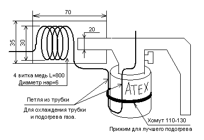 - El tubo se forma en una espiral de cinco vueltas. El diámetro exterior de la pieza de trabajo es 10 mm menor que el grosor de la bombilla parachispas. La espiral se coloca dentro de la cola hacia el final para un mejor calentamiento. Una boquilla de una estufa de gas doméstica se atornilla en el extremo del tubo.