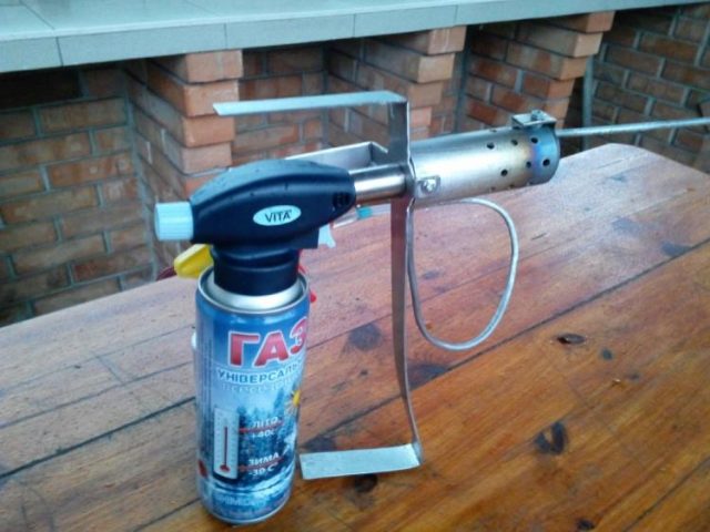 Las dimensiones óptimas de un quemador casero son 70x35 mm. La carcasa exterior está doblada en una hoja de acero inoxidable. En la brida y el enchufe del quemador, se proporciona un borde de aproximadamente 5 mm para un fácil montaje de la estructura. Después de conectar las piezas, se perforan agujeros en la carcasa con un diámetro y un paso de 6 mm entre sí. Un mango está soldado a la brida. El otro extremo del tubo de cobre se sujeta arbitrariamente al cilindro de gas con una abrazadera. La boquilla de pulverización está hecha con un diámetro de 15 mm. La pieza se gira en un torno o la boquilla se retira de una estufa de gas doméstica.