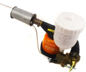 Un buen cañón de humo para abejas se ensambla con un quemador "Atex". El elemento se fija y se quita fácilmente gracias a los tornillos de sujeción. Para desconectar el quemador, afloje el perno en la brida y el tanque. El elemento se gira 90sobre, después de lo cual se desprende fácilmente.