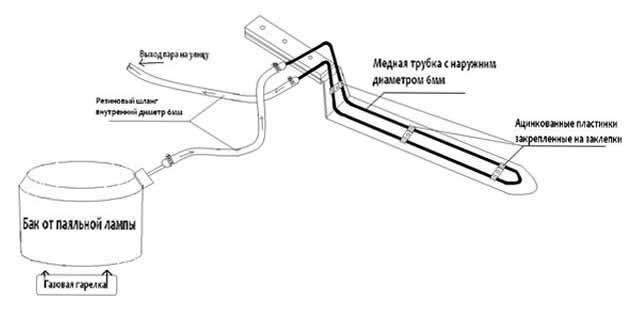 El calentador de cuchillas está hecho de un tubo de cobre delgado. Se suelda a la placa con ácido fosfórico. El tubo debe colocarse a lo largo de los dos bordes de la hoja. El generador de vapor está hecho de una lata o hervidor de aluminio con una capacidad de 5 litros. Se adjunta un tubo de ramificación a la manguera. La conexión está sujeta con una abrazadera de manguera para evitar que el vapor salga de la manguera. El segundo trozo de manguera se coloca en la salida del tubo de cobre que calienta la cuchilla con un extremo. El otro extremo de la manguera se baja a un balde o fregadero para drenar el condensado.
