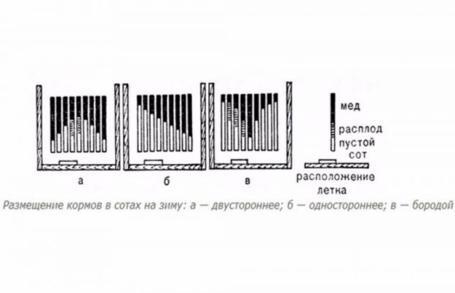 - Barba - adecuado para una familia débil. Los marcos de miel se instalan en el centro, todos los posteriores están en orden descendente. Para proporcionar alimento a las abejas durante todo el invierno, el suministro de miel debe ser de al menos 10 kg. Para que las abejas vayan correctamente a comer, se colocan barras perpendicularmente para ellas como guía.