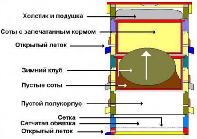 La invernada se lleva a cabo en una colmena de 2 niveles. En la parte inferior y superior del nivel inferior, quedan 8 marcos. No debe haber alimento en los panales inferiores. En el medio de la parte superior del cuerpo, quedan hasta 2 marcos, desde abajo no están completamente llenos. Después del primer vuelo, la colonia de abejas debe ser alimentada. Si hay suficiente comida, al final de la invernada, las abejas se trasladarán a la parte superior del cuerpo, mientras que la inferior se eliminará.