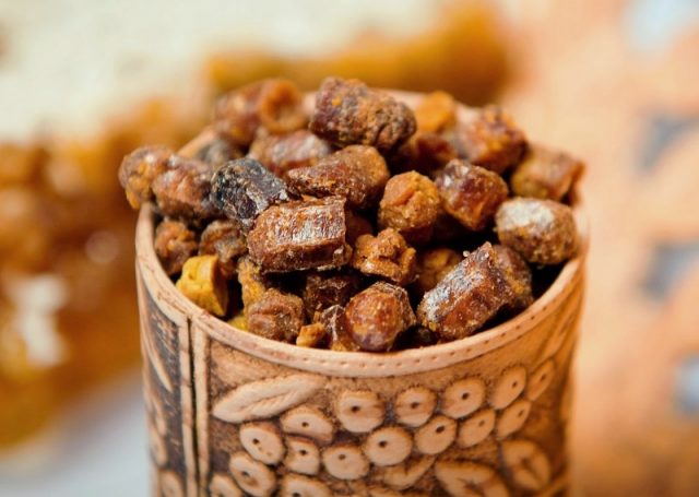 El propóleo (uza, cola de abeja) es una sustancia pegajosa producida por las abejas. Estos insectos lo utilizan con fines de construcción y desinfección: para aislar las paredes de la colmena y sellar grietas, desinfectar los panales antes de poner huevos, momificar otros insectos y escombros. Durante el verano, los apicultores recolectan solo 100-150 g de producto de 1 colmena.