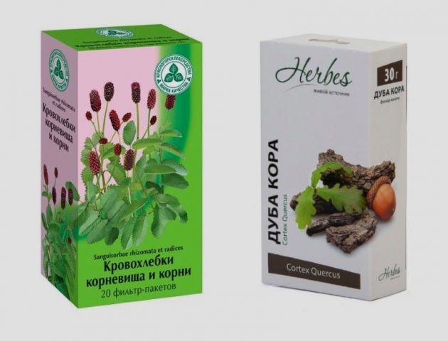 Si el objetivo principal es aliviar el dolor en las hemorroides, entonces, en lugar de manzanilla, debe tomar corteza de roble. Contiene taninos de efecto antiespasmódico y analgésico. Con hemorroides sangrantes, se recomienda hacer enemas con propóleo y una decocción de burnet.