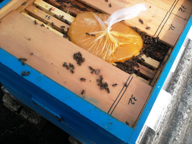 Alimentando a las abejas en agosto con jarabe de azúcar.