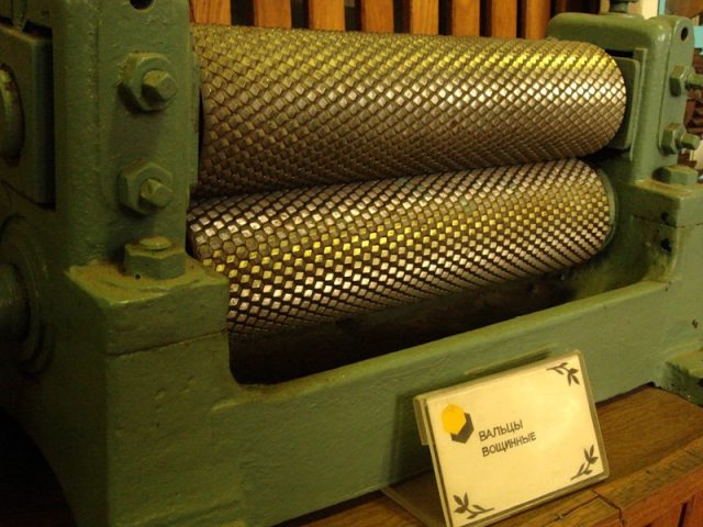 Otro método más civilizado, que le permite obtener la base del grosor deseado la primera vez, implica el uso de rodillos especiales con ejes lisos. Se pasa un bloque de cera caliente a través de ellos y se obtiene una hoja terminada a la salida.