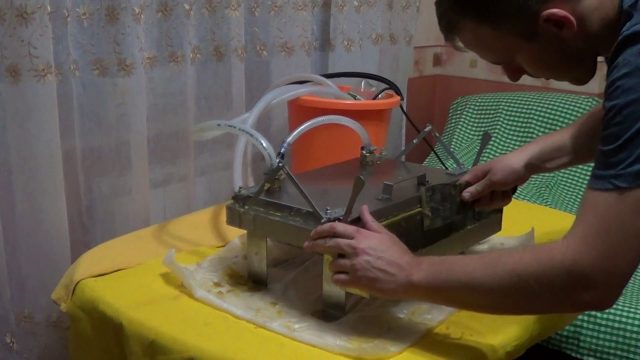 Este es un dispositivo bastante simple con el que puede obtener una cantidad limitada de producto terminado (la productividad promedio de una prensa manual no es más de 10 hojas por hora). Por lo tanto, el uso de una prensa en grandes colmenares no es práctico. El principio de funcionamiento del dispositivo es similar a una plancha para gofres: la prensa consta de dos mitades con partes internas corrugadas. La prensa de fábrica consta de dos placas pesadas, generalmente de aluminio. Están conectados entre sí con un pequeño espacio, que es igual al grosor de la hoja, de 0,2 a 0,6 mm. A veces, los apicultores logran convertir viejas planchas para gofres en una prensa para la base, fijando matrices de silicona para la base en el interior.