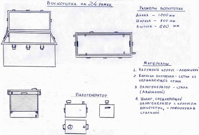 Para el montaje de bricolaje, necesitará dibujos con dimensiones exactas o, en casos extremos, un diagrama de un fregadero de cera de vapor. La estructura se puede ensamblar de acuerdo con sus cálculos individuales. La unidad de vapor para calentar cera consta de 4 unidades principales: