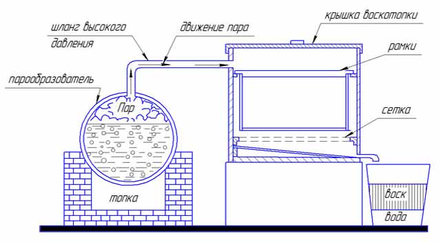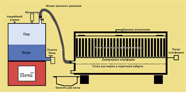 El fundidor de cera a vapor de bricolaje en casa se ensambla a partir de una caja de metal con una tapa de cierre. Se coloca una paleta en la parte inferior, se quita un grifo para drenar la cera derretida. Arriba, se instala una malla de filtro, que separará la grasa de la cera. Los marcos se colocan sobre el filtro colocando sujetadores o una canasta de malla.