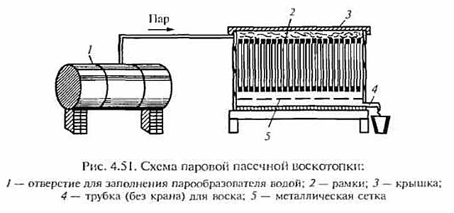 El recipiente inferior se llena con agua y se coloca sobre una estufa de gas o eléctrica. Recoge el resto de los elementos del exprimidor. Se coloca un panal dentro del colador, cubierto con una tapa. El vapor derrite la cera, fluye hacia abajo por los orificios, se recoge en el colector de jugo, desde donde se drena a través de la tubería de ramificación.