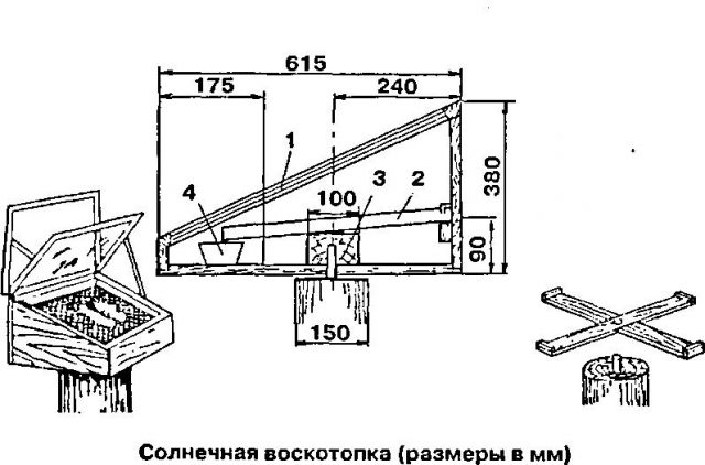 El dispositivo más simple para fundir un producto apícola se basa en el uso de energía solar. El diseño es una caja cubierta con vidrio en la parte superior. Un marco se fija en el interior en ángulo. Los rayos del sol atraviesan el vidrio, calientan el panal a una temperatura de + 70 sobreC. Hay una rejilla debajo del marco. La cera derretida se filtra a través de él y fluye hacia el palet.