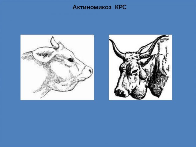 Cuando las mandíbulas o el espacio entre ellas se ven afectados, la forma de la cabeza del ganado cambia. La mandíbula de las vacas se agranda varias veces. A veces, la inflamación se extiende a los tejidos circundantes, por lo que se forman fístulas (orificios) en el paladar y las encías. De ellos se desprende una masa purulenta.