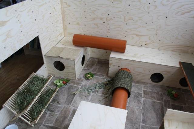 Alguna razas de conejos preferiblemente mantenido sobre un piso sólido y antideslizante. La red que se utiliza para la cría de conejos industriales no es adecuada para la cría de conejos ornamentales si se quiere mantener la salud el mayor tiempo posible. La pododermatitis resultante del daño a las patas de conejo cuando se mantiene en una red no es tan inofensiva como podría parecer. Se trata de heridas abiertas a través de las cuales puede penetrar cualquier infección. Al mismo tiempo, el piso de plástico liso y resbaladizo tampoco es adecuado para tener un conejo decorativo. Un palet elevado o un suelo de rejilla es mucho más adecuado. Hay que tener en cuenta que no todos los conejos decorativos se pueden adiestrar en la bandeja. Quizás cualquier fondo con una gruesa capa de heno es lo que necesita tu conejo decorativo. El tamaño de la jaula se calcula en función del tamaño de la raza prevista. EN una jaula para un conejo decorativo en posición de reposo, es decir, tendido de costado en toda su altura, se debe colocar el propio conejo decorativo, su abrigo, un pesebre para heno, un comedero, un bebedero y una bandeja. Este es el mínimo necesario para la vida de un conejo decorativo.