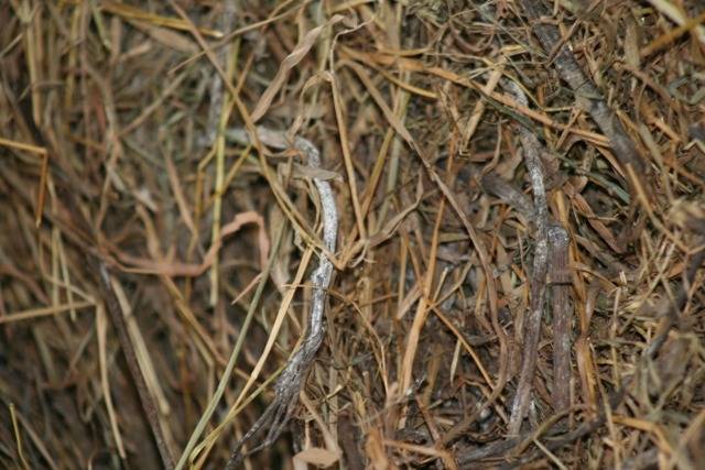 El heno que no se debe alimentar tiene un color marrón y un olor a micelio. Dicho heno debe enviarse inmediatamente a la basura.