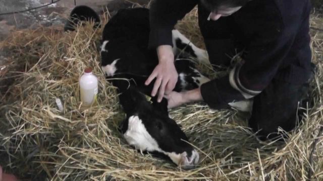Con deshidratación severa, cuando el ternero ya no puede beber por sí solo, se inyecta 1 litro de electrolito por vía intravenosa 3 veces al día: 0,5 litros de solución salina de cloruro de sodio y 0,5 litros de solución de bicarbonato de sodio al 1,3%.