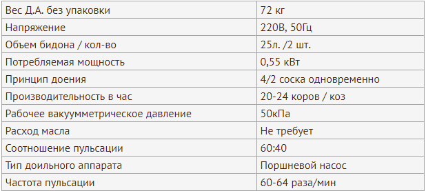 La tabla muestra las características de la máquina de ordeño Burenka "Tandem". El dispositivo está equipado con un cómodo carro de transporte. Todos los equipos tienen acceso gratuito. Las dimensiones compactas, la distancia entre ejes confiable le dan al modelo maniobrabilidad.
