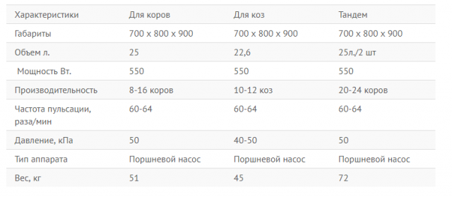 - Modelos secos para ordeñar 10 vacas. Los dispositivos están equipados con un motor de 0,55 kW con una velocidad de rotación de 1,5 mil rpm.