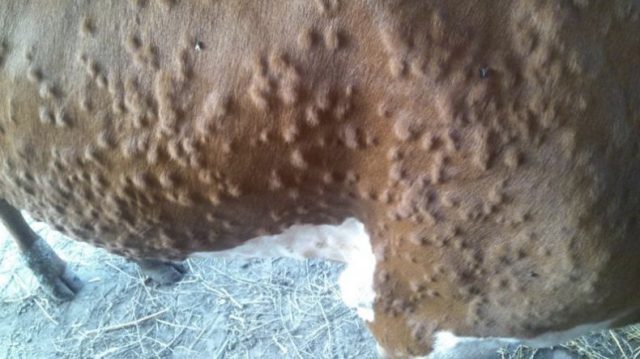 Por separado, vale la pena señalar la presencia en el ganado de tubérculos subcutáneos duros en la piel, que luego se convierten en fístulas; este es el primer signo de que un individuo está infectado con las larvas de un tábano subcutáneo. El número total de tubérculos en el cuerpo de un animal puede llegar a 100-150 piezas. y más. La mayoría de ellos se localizan en la región lumbar del ganado.