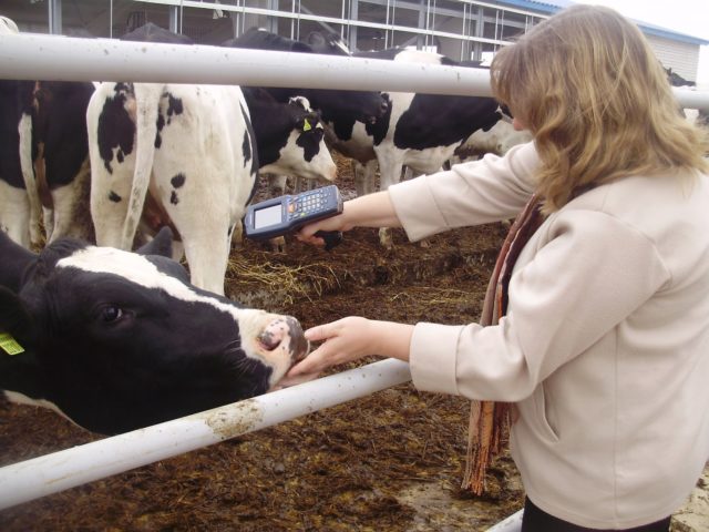 La identificación posterior del ganado se lleva a cabo mediante un dispositivo de escaneo.Para determinar el número individual, basta con acercar el escáner al sitio de implantación del microchip y la información se muestra en la pantalla, el dispositivo emite una señal de sonido.