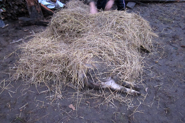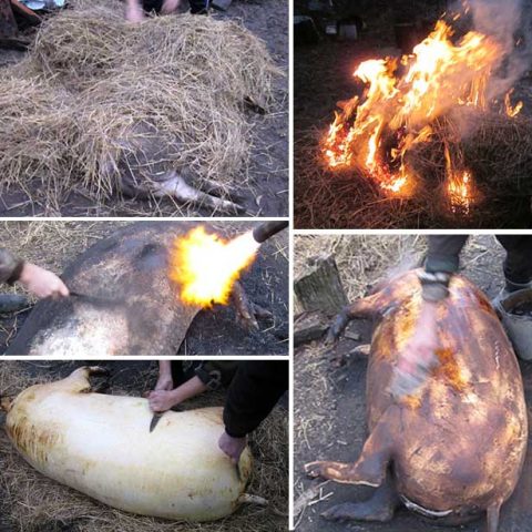 Es muy importante quemar al cerdo después del sacrificio. Este es el mismo procedimiento necesario que cortar la canal, pero chamuscar inmediatamente después del sacrificio, mientras la canal aún está caliente.