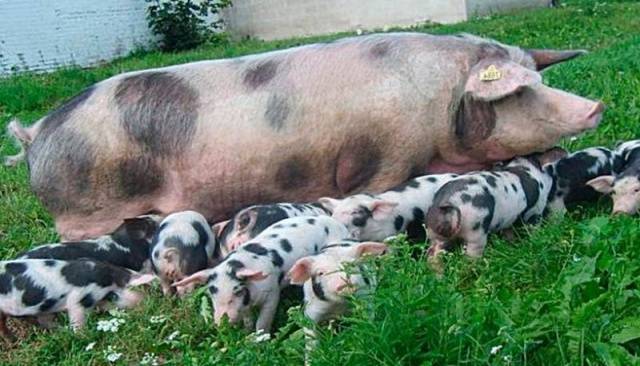 Para aumentar la producción de leche, la cerda necesita ser alimentada 4 veces al día, proporcionando un alimento rico en calorías y jugoso. Con alimentos complementarios debidamente organizados, puede salvar incluso una docena de lechones Pietrain como en la foto de abajo.