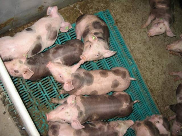 Debido a la capa muy fina de tocino, los cerdos Pietrain no toleran tanto el frío como el calor por igual. Ya a + 15 ° C, se sienten incómodos. Y a + 30 ° C pueden sufrir un golpe de calor. Para criar esta raza de cerdos, se requiere una pocilga de clima controlado especialmente equipada. En Rusia, los sistemas de calefacción se instalan tradicionalmente en habitaciones para animales; por lo general, no se requiere refrigeración en verano. Pero no en este caso. Para que el ganado de estos cerdos se sienta bien, será necesario instalar un acondicionador de aire en la pocilga. En particular, en la foto hay un cerdo Pietrain en una pocilga tan especialmente equipada.