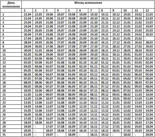 En la primera columna vertical, debe encontrar el número cuando el cerdo se apareó realmente, y en la línea horizontal superior está el mes en que ocurrió este evento. En la celda donde se cruzan la fila y la columna encontradas, se escribe la fecha a partir de la cual es necesario esperar el parto todos los días.
