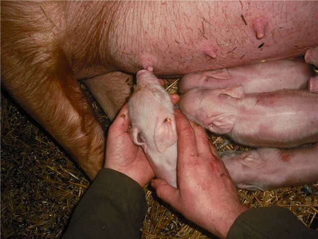 Mientras alimenta a los bebés, el cerdo puede mantenerlos alejados de la ubre, acostarse boca abajo.En este caso, debe inspeccionar la ubre y, si se encuentran pequeñas heridas en ella, los caninos de leche de los cerdos se rompen 2 mm con unas pinzas.