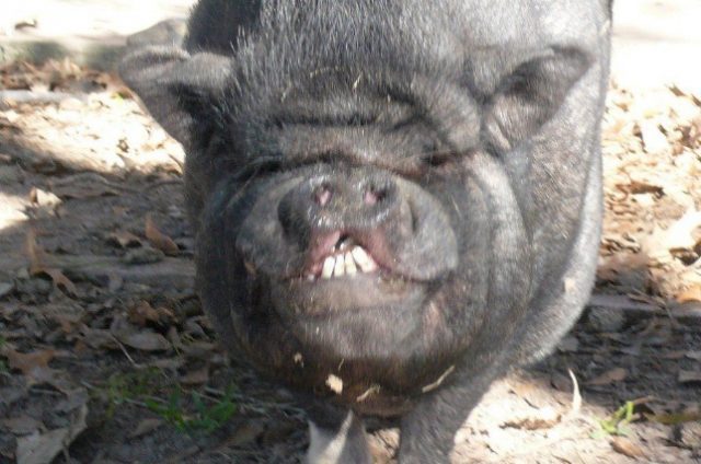 Si el lechón resulta tener carácter, morderá. Es difícil controlar la mordedura de un cerdo. Lo miran de frente, y el cerdo tiene un parche sedentario frente a él. La posición de la mandíbula inferior en el cerdo se evalúa mirándola desde abajo. El rebasamiento será claramente visible.