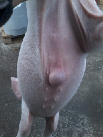 Con hernias estranguladas, el animal está inquieto. Los cerdos pueden vomitar.La hinchazón es caliente y dolorosa a medida que comienza a desarrollarse la peritonitis.