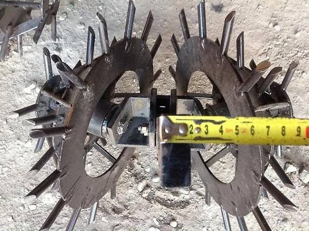Los erizos de patata están hechos de tres anillos de diferentes tamaños. Los discos están soldados entre sí con puentes. Al final de cada anillo, se sueldan púas de piezas de una varilla de metal. El resultado es una estructura cónica, que se suelda a una tubería de acero con un eje en el interior.