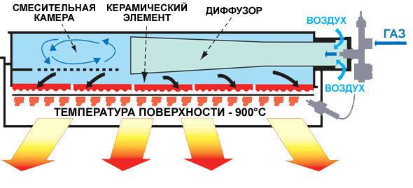 La combustión del gas tiene lugar dentro del calentador cerámico sin que se forme una llama. Hay modelos que pueden calentar baldosas cerámicas hasta 900sobreC. Es conveniente cocinar sobre ellos la comida mientras camina. La desventaja de un dispositivo móvil es el suministro de calor puntual, que no permite calentar un espacio grande.