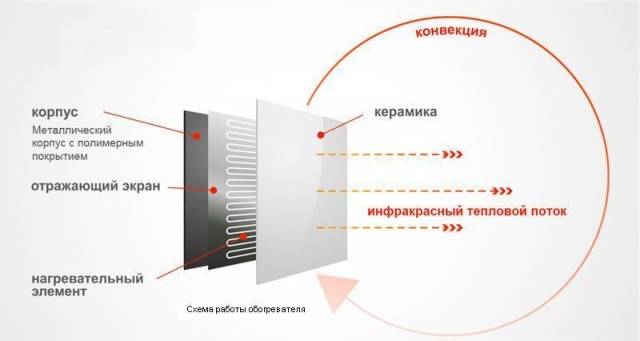 La calefacción por infrarrojos también se basa en el principio de convección. El aire frío de la habitación pasa a través del elemento cerámico. Después de calentar, entra a la habitación, emitiendo calor a los objetos. Es decir, se obtiene el principio de radiación solar térmica.