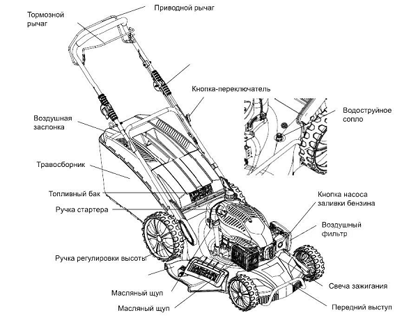 - Lo primero que debe hacer antes de arrancar el motor de la podadora es verificar la posición de la perilla de velocidad. Si la transmisión está encendida, debe apagarse; de lo contrario, tan pronto como arranque el motor, la cortadora de césped comenzará a moverse por sí sola.