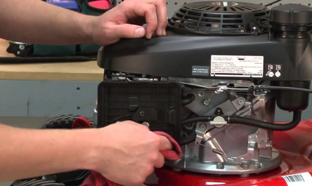 - Con el encendido apagado con un motor de arranque o un cable enrollado (todo depende del diseño de la cortadora de césped), se gira el eje del motor. En este caso, la compuerta de aire está en posición abierta.