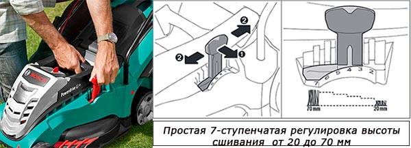 Para lograr la altura de corte requerida en el cortacésped, hay una palanca especial que le permite subir y bajar las cuchillas. Dependiendo del modelo, puede haber dos palancas y el número de pasos es diferente. Por ejemplo, el ajuste de 7 pasos le permite ajustar la altura de corte de 20 a 70 mm.