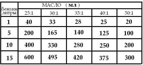 Para la conveniencia de la preparación del combustible, es conveniente utilizar la tabla.