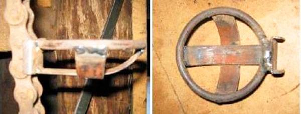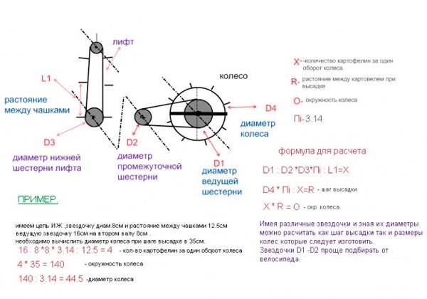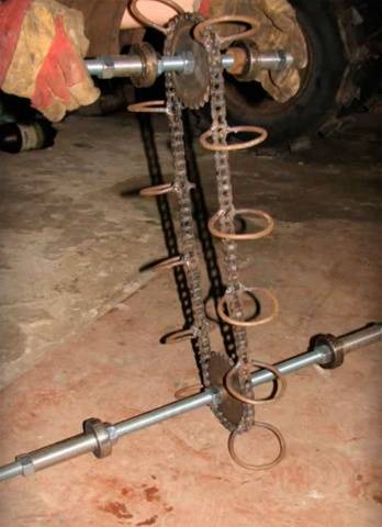 - El mecanismo de cadena funciona como un transportador. Se pone en movimiento mediante un asterisco unido al eje de las ruedas. Se instala una segunda rueda dentada sobre la pared trasera de la tolva para tensar el mecanismo. El transportador suele estar hecho de una cadena de bicicleta o motocicleta. Los cuencos de alambre se sueldan a sus eslabones a la misma distancia.