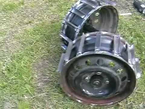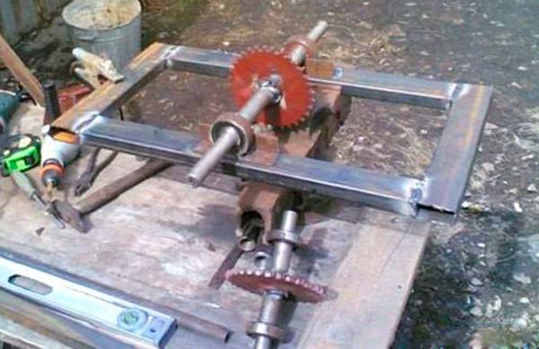 - El montaje del eje comienza con la instalación del piñón. Se puede fijar a la llave apretando las tuercas en ambos lados. Es más fácil soldar un asterisco, pero este diseño no será plegable. Si los dientes están rotos, la rueda dentada deberá cortarse con una amoladora o un cortador. Además, los cojinetes se colocan en el eje, la estructura se instala en las jaulas preparadas. En los extremos del eje, se adjunta un cubo de rueda. Para evitar que los cojinetes con el eje se salgan de las jaulas durante el movimiento del tractor de empuje, atornille dos topes desde la esquina metálica al bastidor.
