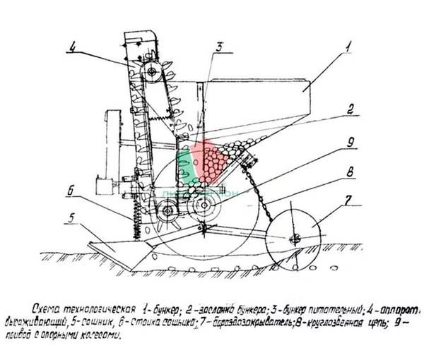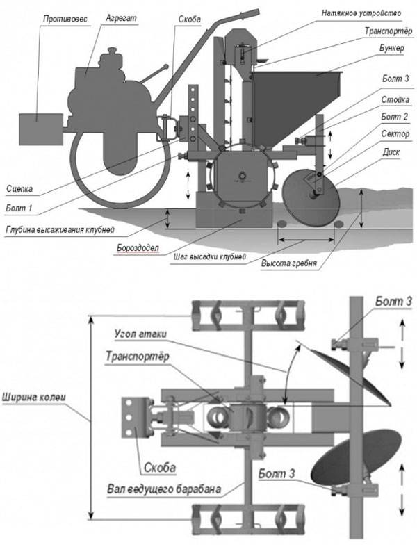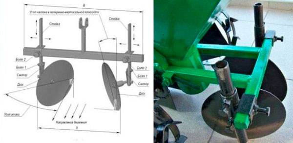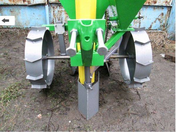 Al final del marco de la maceta, se instalan dos discos en ángulo. Después de alimentar el tubérculo, llenan el surco con tierra. Para que las papas caigan en el agujero de manera uniforme, los tazones se unen al mecanismo de cadena a la misma distancia. El tamaño del enganche y el volumen de la tolva de aterrizaje se seleccionan individualmente, teniendo en cuenta la potencia del tractor con operador a pie o del minitractor.