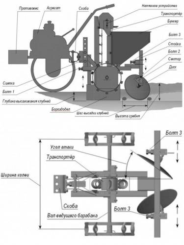 Ese es todo el dispositivo de la sembradora de papas. Un mecanismo tan simple le permitirá plantar rápidamente su jardín con un tractor de empuje.