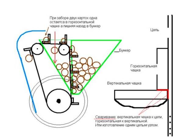 - El número de tazones se calcula para que los tubérculos caigan al surco cada 25-30 cm, esto se hace de forma empírica, ya que todo depende del diámetro de las estrellas y de la longitud de la cadena. Los cuencos terminados se sueldan a los eslabones de la cadena a la misma distancia.