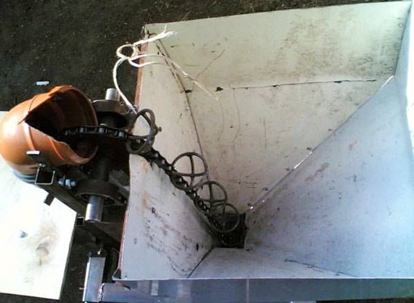 - Cuando la tolva esté lista, coloque la cadena en su lugar. Ahora hay un ajuste fino del mecanismo. Primero, se tira de la cadena, después de lo cual, mientras la desplazan, miran para que el transportador no se adhiera a los bordes del contenedor. Cuando se encuentra la ubicación óptima de la tolva, se fija rígidamente.
