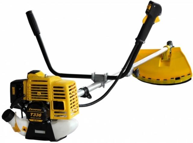 La Trimmer Champion T 336 está equipada con un motor de dos tiempos de 0,9 kW. Sin carga, la velocidad de rotación máxima de la boquilla de trabajo es de 8.5 mil rpm. La recortadora tiene un mango cómodo, una varilla recta plegable, un tanque de combustible con una capacidad de 0,85 litros. La herramienta de corte es un cuchillo de acero con cuatro hojas y una línea con un grosor de 2,4 mm. Peso de la herramienta: 5,9 kg. La recortadora se considera para uso doméstico. Es utilizado por los propietarios de casas de campo y casas de verano para cortar el césped en los alrededores.