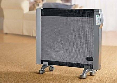 El elemento de trabajo del calentador micatérmico está hecho de placas de aleación especial tratadas con mica. Durante el paso de una corriente eléctrica a través de ellos, se emiten ondas infrarrojas. Las placas se calientan a un máximo de 60sobreC, que elimina la posibilidad de quemarse al tocarlos. Los calentadores con calentadores micatérmicos tienen un diseño moderno. Su desventaja es su alto costo y baja eficiencia, que asciende a un máximo del 80%.