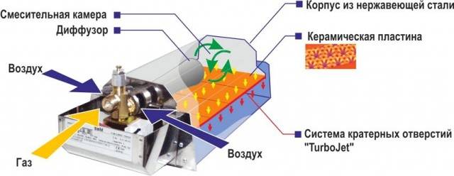El diseño del calentador consiste en una bobina que calienta el panel cerámico. La parte superior de la cerámica está tratada con una capa de esmalte especial. La eficiencia del calentador de cerámica es al menos del 80%.