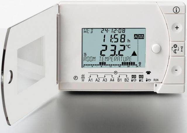 Modelos electronicos más preciso. Tienen función de programación. El cambio de modos de funcionamiento se realiza en la pantalla táctil o mediante botones. La desventaja de los termostatos electrónicos es el alto costo y la complejidad del control.