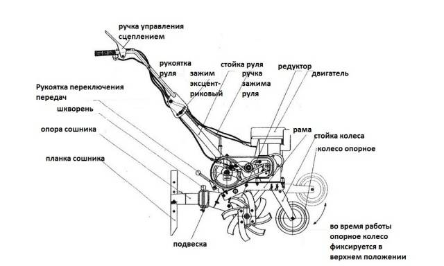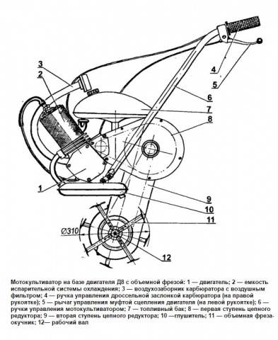 Entonces, un motocultivador necesita un motor de combustión interna enfriado por aire. En nuestro ejemplo, tomemos un modelo D 8 de un ciclomotor viejo. La foto muestra un diagrama del cultivador. A partir de él, puede determinar la ubicación de todos los nodos.
